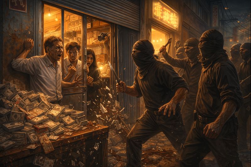 Một đêm, khi xung quanh mọi người vừa đóng cửa, vài kẻ lạ mặt che khăn đen đến đập cửa. Nhân viên chẳng biết chuyện gì vội chạy ra mở cửa thì đám côn đồ bậm trợn chửi mắng om sòm, đe doạ đòi đâm chém. Mọi người run lẩy bẩy kêu ông chủ ra giải quyết bọn chúng đập phá nhiều hơn, nhưng chỉ trong giấy lát là kéo nhau đi mất như chẳng có chuyện gì.