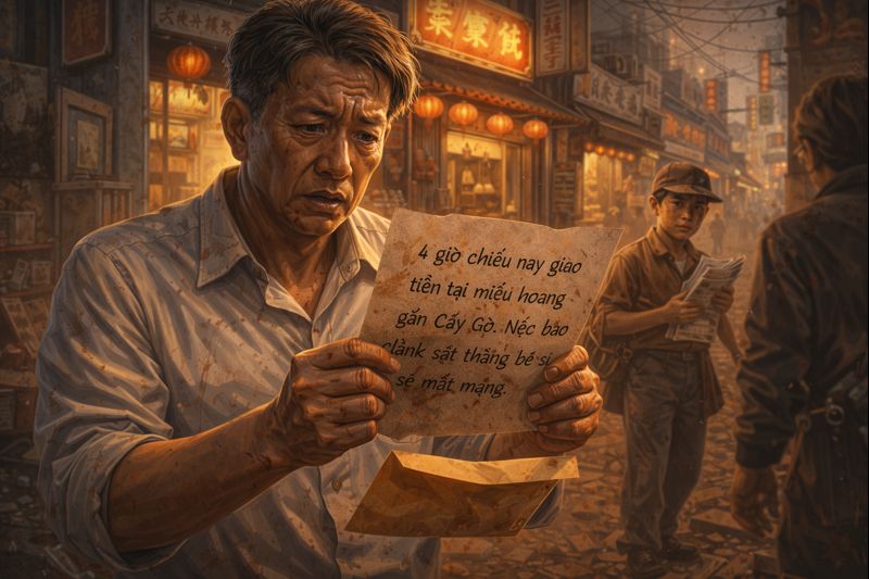 3h chiều hôm đó lão đã tìm đủ tiền chuộc nhưng không biết giao ở đâu thì có đứa bé bán báo khác xuất hiện. Nó nói có chú kia bên đường gửi phong thư này. Lão Lý nhìn sang bên đường người đó đã biến mất. Lão vội vã mở ra xem thì thấy “4 giờ chiều nay giao tiền tại miếu hoang gần Cây Gõ. Nếu báo cảnh sát thằng bé sẽ mất mạng”.