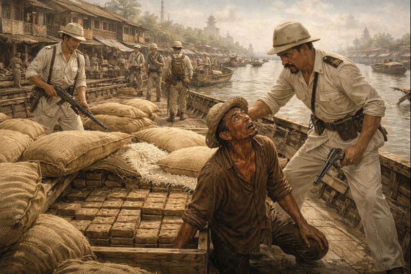 Có lần, cảnh sát Pháp chặn ghe chài chở gạo trên sông Sài Gòn. Khi lật lớp gạo lên cảnh sát phát hiện hàng trăm ký thuốc phiện giấu phía dưới. Ghe bị tịch thu, tài công bị bắt, bị đánh đập nhưng một mực không khai vì đó là hàng của Tam Hoàng. Viên thanh tra Pháp gầm lên: